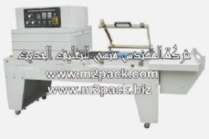 ماكينة تغليف زجاجات زيت الفول السوداني بفيلم الشرنك الحراري مع ماكينة اللحام والقطع شكل Lنصف اتوماتيكية موديل 107 النموزجية إم تو باك :